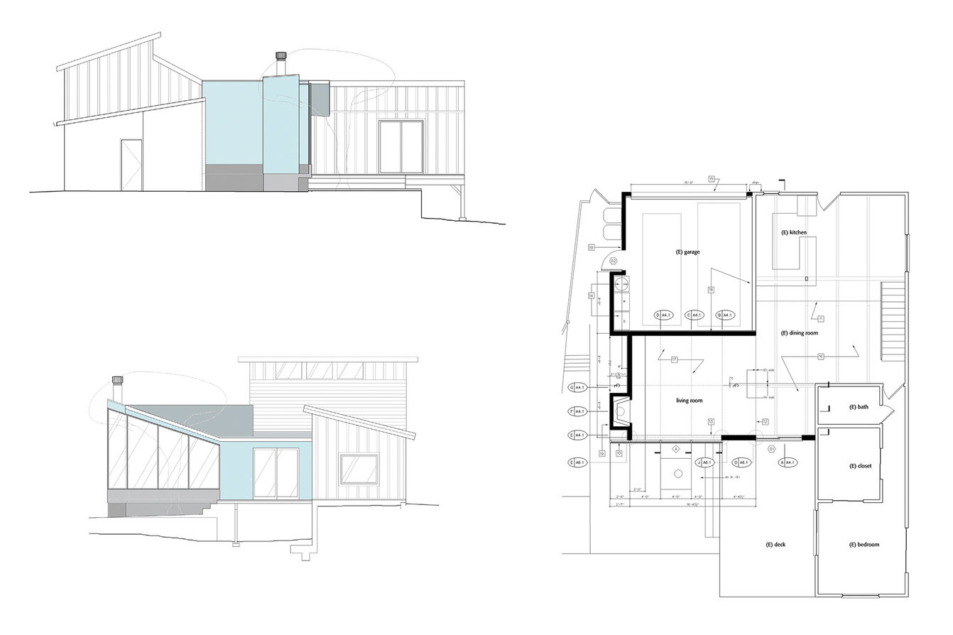 This living room extension was constructed at the intersection of three sharply conflicting roof slopes, twisting them to extend and reorient the house toward canyon views. New polished concrete at the floor slab and the fireplace hearth extends to the outside and supports an oversized picture window. The extended storefront window forms a frame for the mass of the project as it allows a view toward the canyon below.