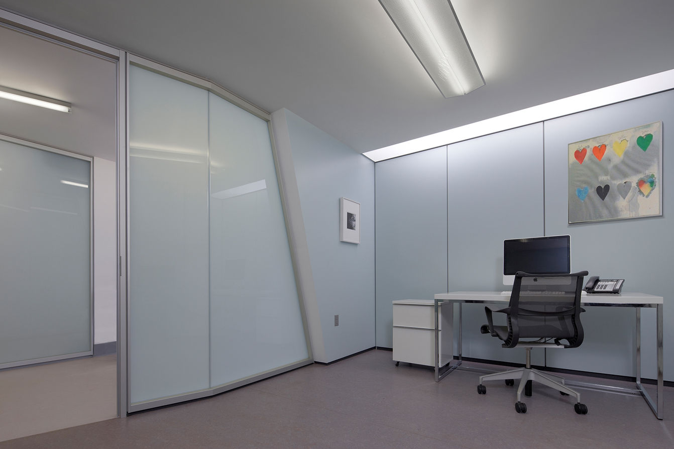 In our project an architectural language of diffuse glazing, screens, color and lighting plays against the robust existing brick and bowstring truss shell, creating an environment distinct from the surrounding neighborhood. Safety and accessibility concerns dictate a multi-step identification and entry process that employs this scheme of color and light as a gentle wayfinding system.